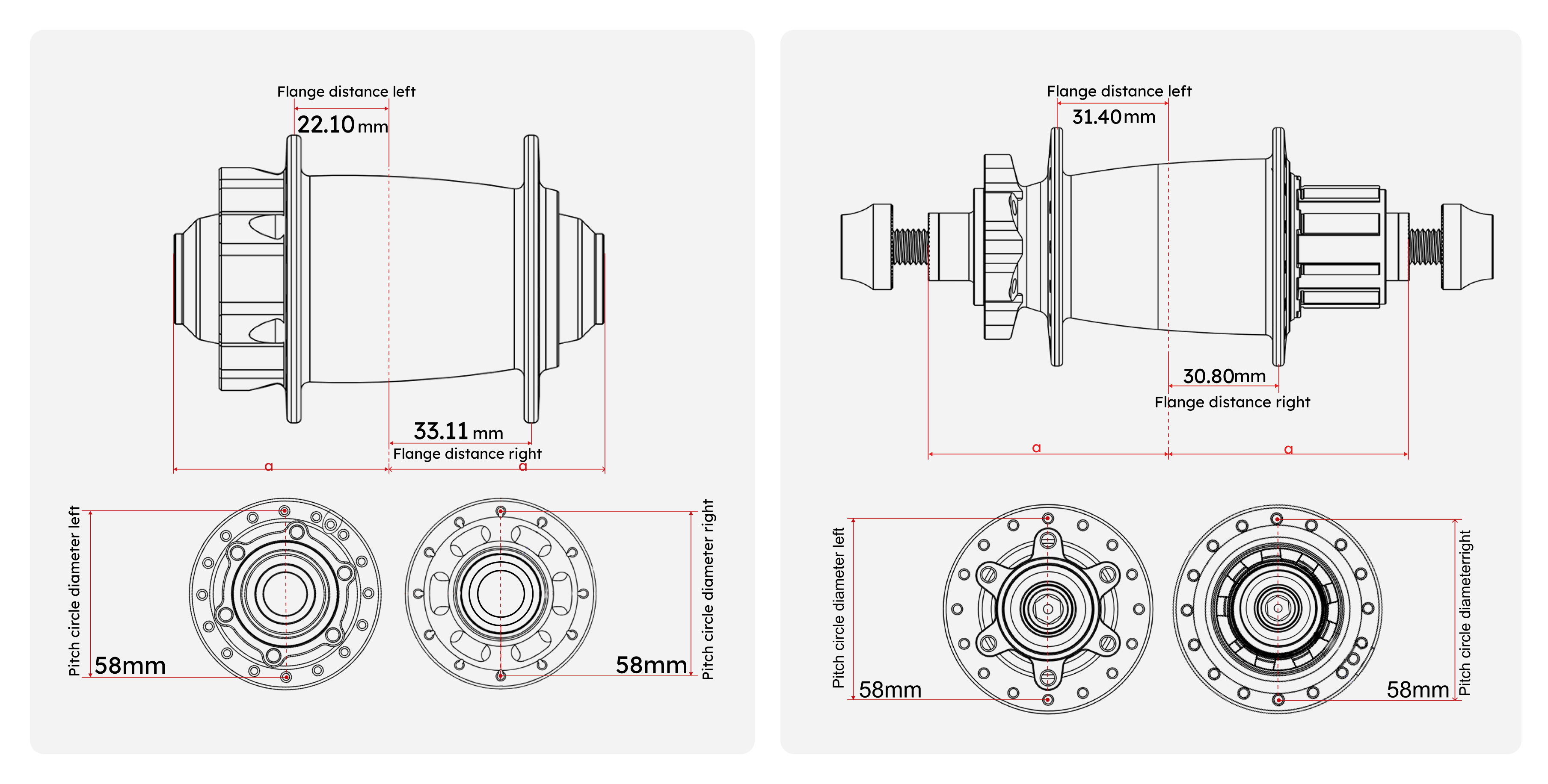 - Il nuovo E1.2 single speed è assemblato con 2 cuscinetti sigillati in acciaio inox anteriori e 4 posteriori, disco a 6 bulloni, 32H, 6 nottolini, 57 denti, innesto 114p, peso circa 213g anteriore e 409g posteriore; asse predefinito da 100 * 15 mm, adatto per forcelle per bici RockShox Pike DJ; incluso fondello da 110 * 20 mm, adatto per forcelle Manitou Circus Expert DJ e forcelle Marzocchi Bomber 2023; Flangia dei raggi più grande per consentire costruzioni di ruote più rigide, fornendo maggiore stabilità per prestazioni migliori nel salto con la terra.